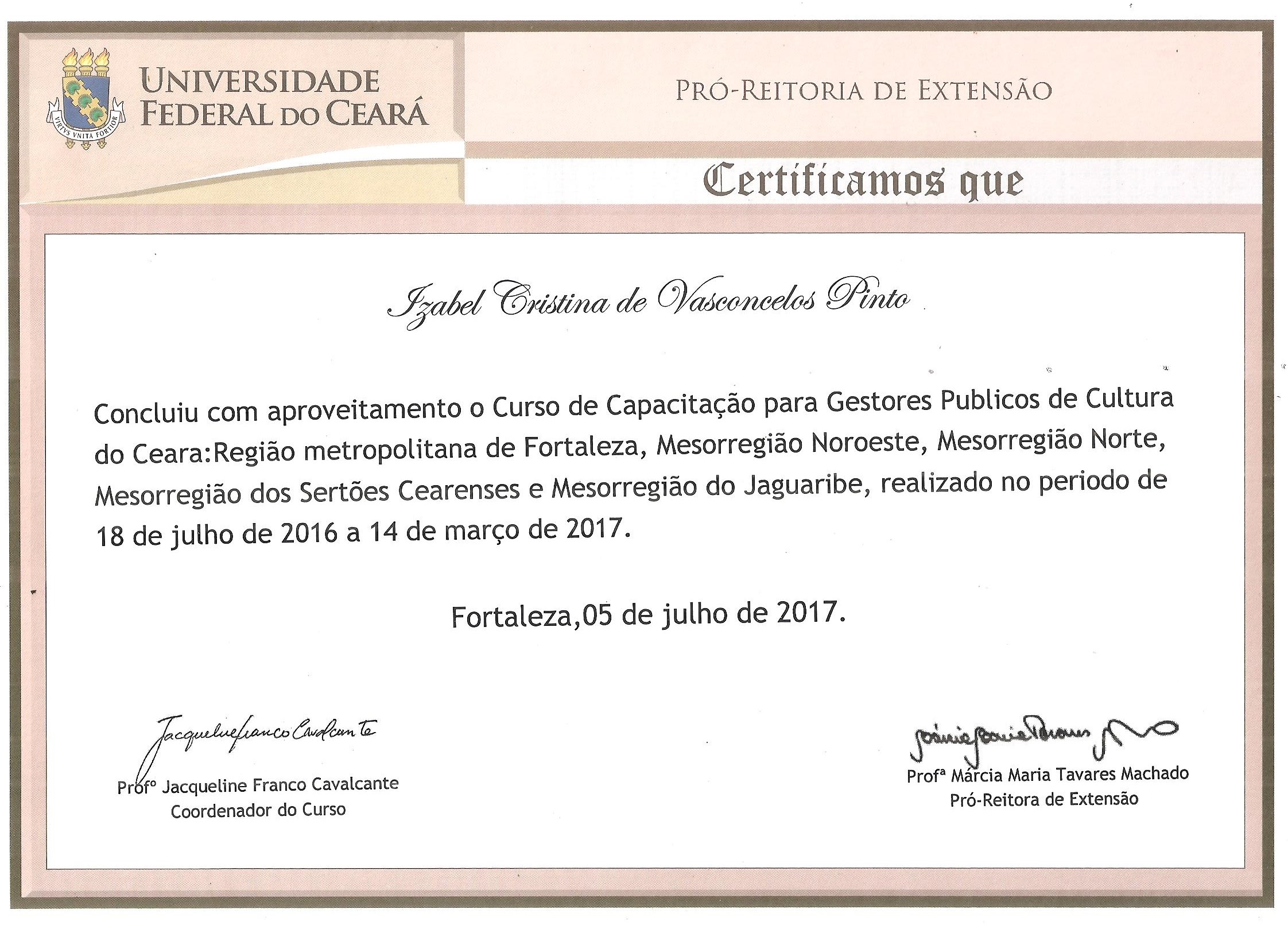 2010 Graduada em Artes Cênicas - Instituto Federal de Educação, Ciência e Tecnológico do Ceará – IFCE