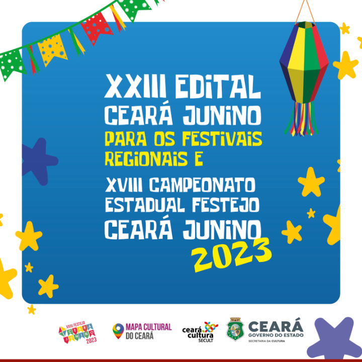 O Objetivo do XXII Edital Ceará Junino para os Festivais Regionais e XVIII Campeonato Estadual Festejo Ceará Junino - 2023 é selecionar e apoiar a realização de iniciativas destinadas à promoção, preservação e difusão das tradições regionais cearenses voltadas para as manifestações próprias do ciclo junino por meio da seleção pública de uma Instituição Jurídica de Direito Privado Sem Fins Lucrativos para formalizar parceria com a SECULT Ceará, em regime de mútua cooperação, para realização dos 21 Festivais Regionais de Quadrilhas Juninas, e o XVIII Campeonato Estadual Festejo Ceará Junino. Os eventos devem ser realizados em Fortaleza ou qualquer município do Ceará, entre os meses de junho, julho e de 2023. O edital ficará aberto para conhecimento público durante 30 dias. Imediatamente após o período de divulgação, serão abertas as inscrições, no período de 15 dias corridos.