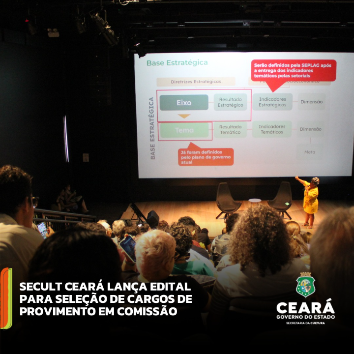 A Secretaria da Cultura do Estado do Ceará - Secult/CE abre inscrições para seleção de 06 (seis) candidatos destinados a ocupar os seguintes cargos de provimento em comissão: Coordenador da Coordenadoria de Tecnologia da Informação e Governança Digital (Cotig); Coordenador da Coordenadoria de Diversidade, Acessibilidade e Cidadania Cultural (Codac); Orientador da Célula de Participação Social (Cepas); e Supervisores dos Núcleos Regionais do Sertão Central (Nusec), do Núcleo Regional do Cariri (Nucar) e do Núcleo Regional Norte (Nunor).